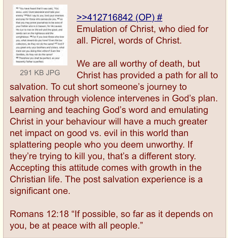 >>530346525Ask yourself "Is the invaders also my neighbor?"Hint:>(Matthew 5:44) However, I say to YOU: Continue to love YOUR enemies and to pray for those persecuting YOU;>(Matthew 26:52) Then Jesus said to him: “Return your sword to its place, for all those who take the sword will perish by the sword.>(John 18:36) Jesus answered: “My kingdom is no part of this world. If my kingdom were part of this world, MY ATTENDANTS WOULD HAVE FOUGHT THAT I SHOULD NOT BE DELIVERED UP TO THE JEWS. But, as it is, my kingdom is not from this source.”>(Romans 12:17-19) Return evil for evil to no one. Provide fine things in the sight of all men. 18If possible, as far as it depends upon YOU, be peaceable with all men. 19Do not avenge yourselves, beloved, but yield place to the wrath; for it is written: “Vengeance is mine; I will repay, says Jehovah.”>(Romans 12:20) But, “if your enemy is hungry, feed him; if he is thirsty, give him something to drink; for by doing this you will heap fiery coals upon his head.”>(Proverbs 25:21) If the one hating you is hungry, give him bread to eat; and if he is thirsty, give him water to drink.>(Proverbs 24:17) When your enemy falls, do not rejoice; and when he is caused to stumble, may your heart not be joyful,