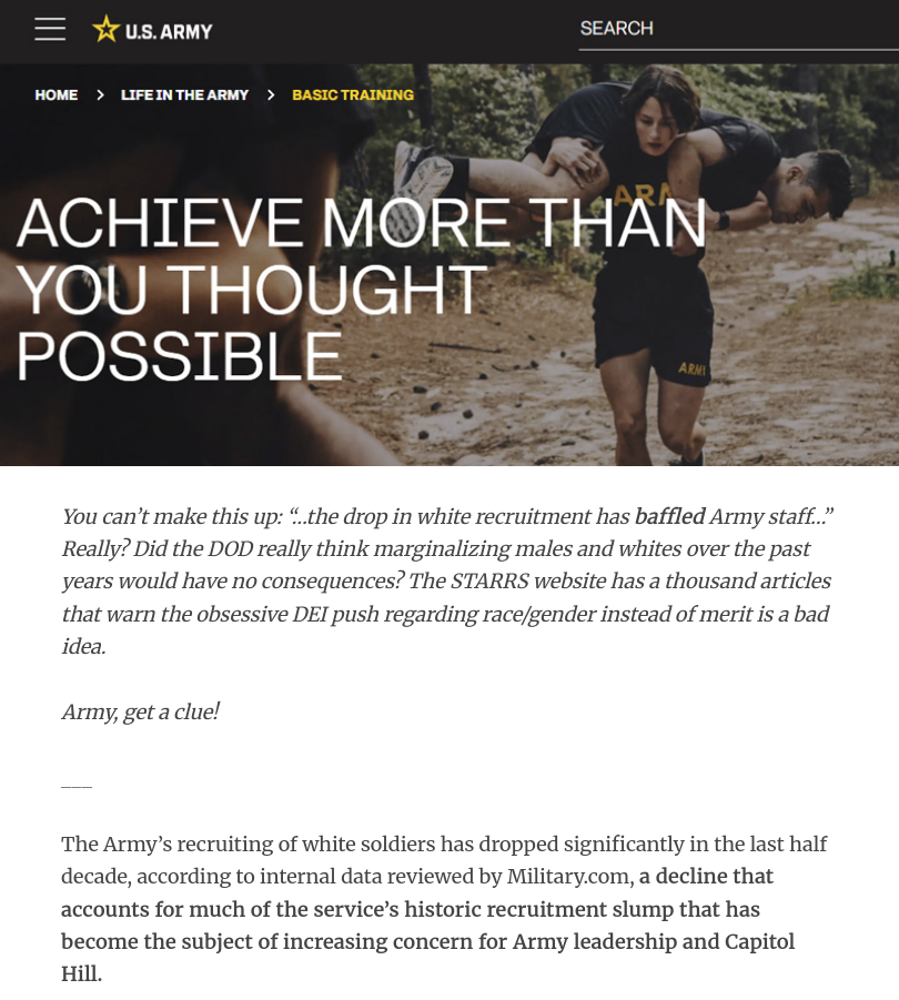 >specifically army recruitmentIt's often said they're the literal worst branch to join. A common military shill tactic is telling people to willingly enlist just to dodge having to join the army as an expendable meat sack in case of a draft. With a rep that bad I think their problem is bigger than just not appealing to white guys.