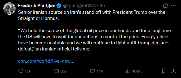 >Trump via TruthSocial: Short term oil prices, which will drop rapidly when the destruction of the Iran nuclear threat is over, is a very small price to pay for U.S.A., and World, Safety and Peace. ONLY FOOLS WOULD THINK DIFFERENTLY!