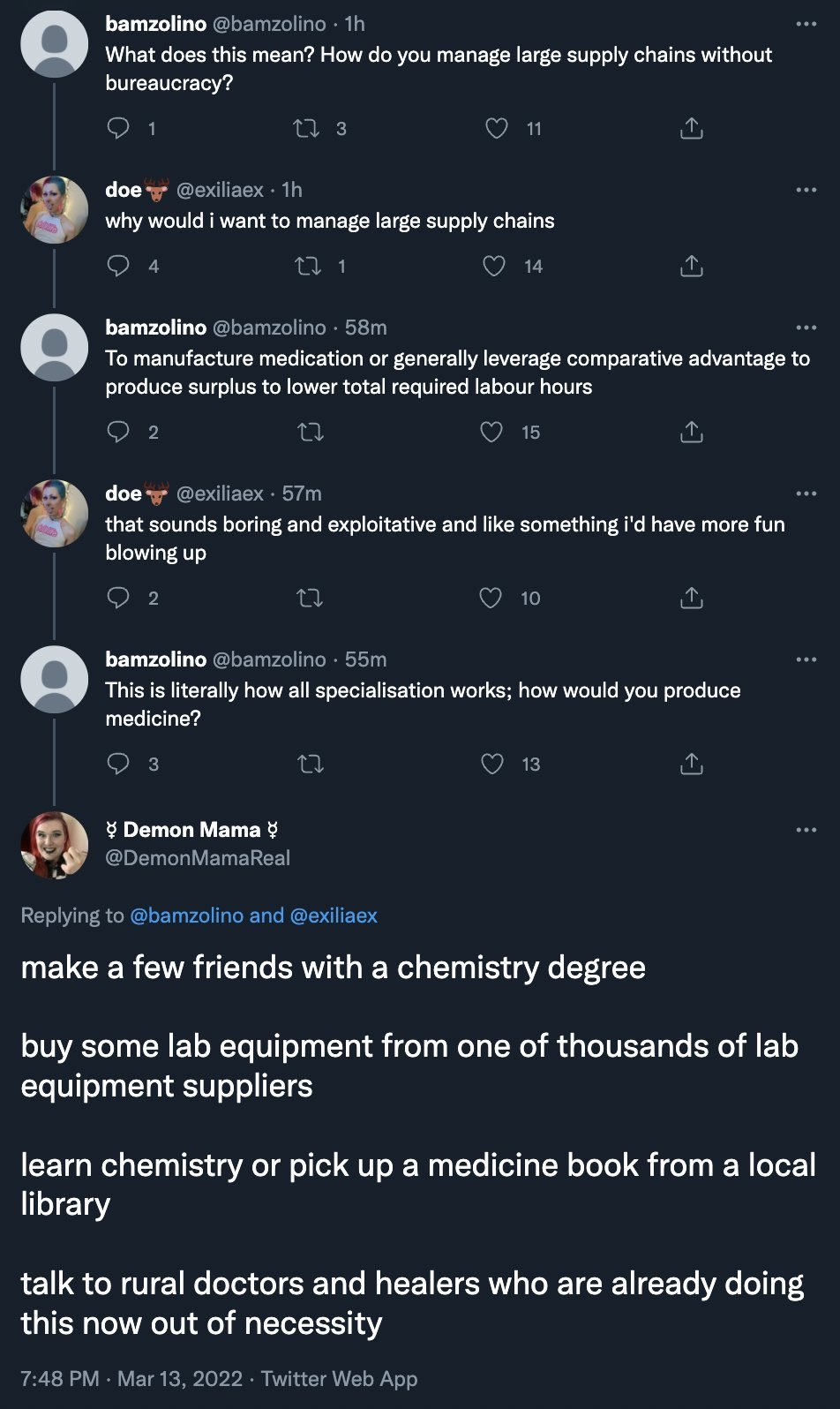 >>530355575unironically most medicine can be constructed in a basement with dirty glassware stolen from an abandoned collegeYes, you need very specialized equipment, a cleanroom/hood, support staff, and industrial substance handling equipment (and more) to make shit like exosomes, mAb's, etc.However, basically EVERYTHING on the WHO's essential medicines list can be manufactured with google scholar, the necessary chemicals, and access to a college lab building. Cletus has been making meth by the pound with a 6th grade education and some grit, and you're paying $8/per for the same thing