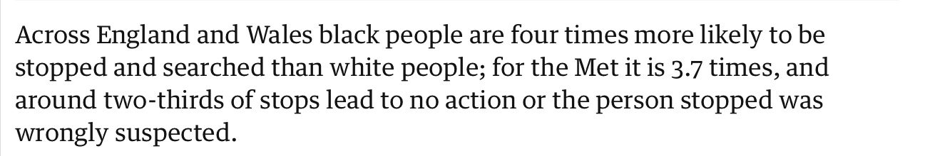 >>530362440Good point, it’s unclear but the article is about blacks being 40x stop and searched vs whites in rich white boroughs, so I assume it’s figures for blacks because they’ve reversed the way of looking at it.Guardian though so wouldn’t put it past them.