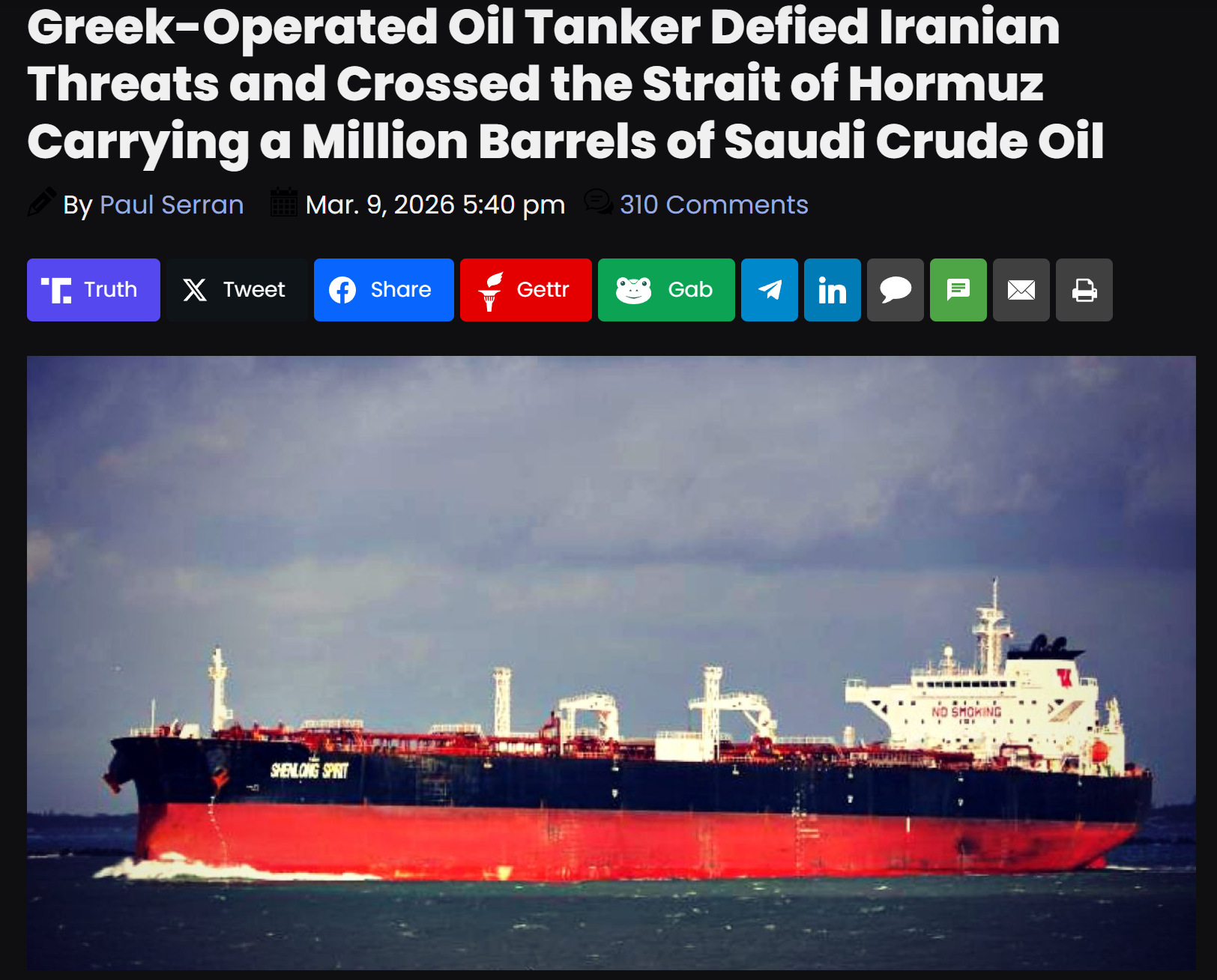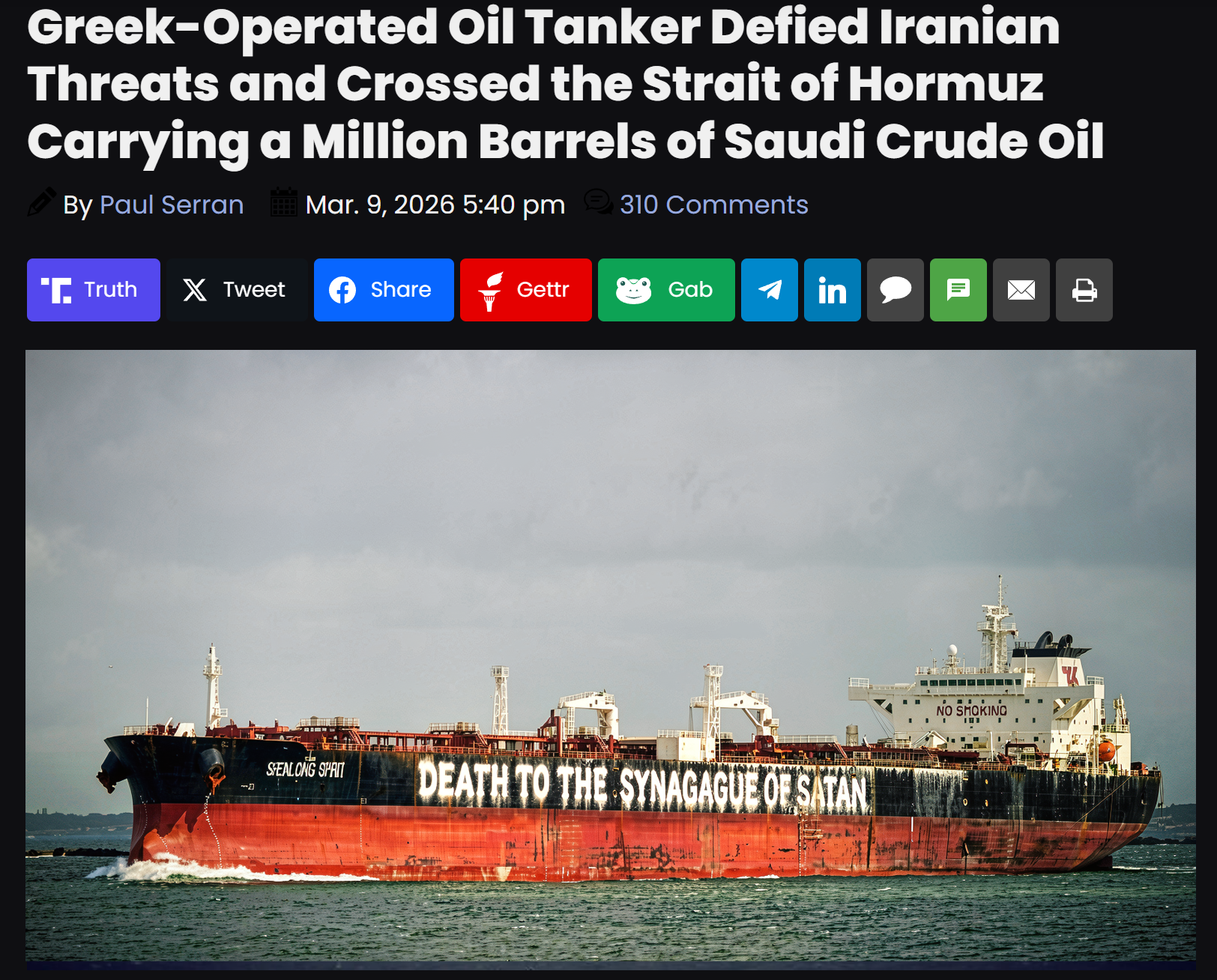 >>530359782a couple of days ago they were already saying the greek companies were offering to run the straight for the right https://www.chosun.com/english/world-en/2026/03/07/H7YY4UACYBG45PQO5ZEDJ5ESH4/>To avoid becoming targets of Iranian attacks while passing through the strait, Procopiou’s vessels turned off their transponders (location signaling devices) and hired armed guards to patrol the decks. However, The Wall Street Journal reported that the ships would have sunk immediately if hit by a missile or drone attack. It is said that crew members undertaking these dangerous voyages are being paid very high salaries.>According to industry sources, Procopiou’s side offered rates of up to 440,000 dollars (approximately 650 million Korean won) per day, about four times the pre-war freight ratesi imagine most of these crew aren't even greek but internationals from even poorer third world countries