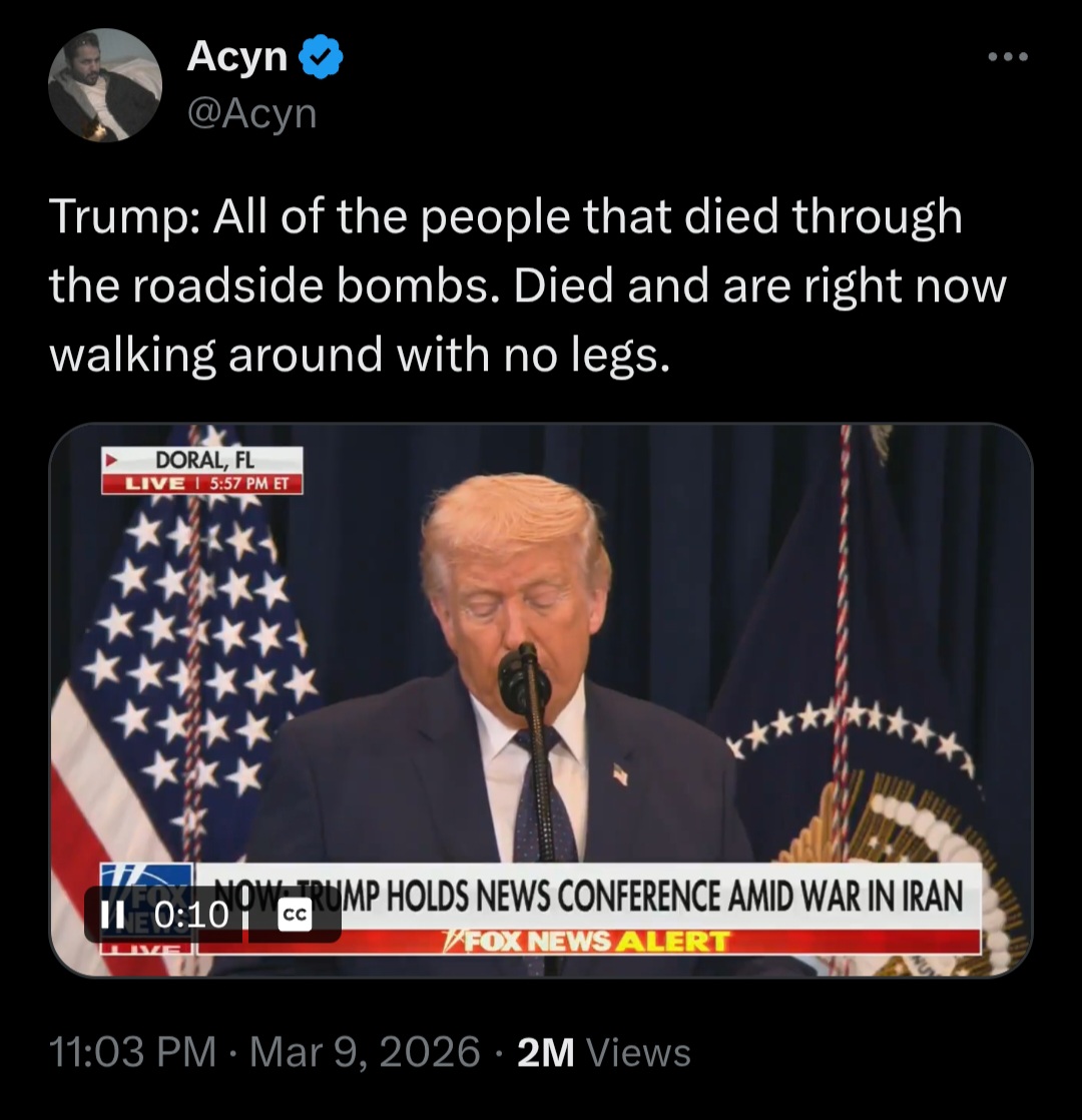 >>530360203>Iran can crank out far more drones than the US can obtain interceptors850, 680, 530, 480, 350, 220, 130, 110, and 60. That is drones launched each day by Iran for the last ten days. Now I know I am giving you FAR more credit than you deserve, but I’m going to say that even you can tell what’s happening with those numbers. Sucks doesn’t it anon? You can lie all you want, but numbers always shine the light on your faggot propaganda. >Iran can blackmail the entire planet by closing the Hormuz StraitThe strait that was reopened??? How’s that working out for ya fella?>Iran's population is cohesive in the face of an external threatActually the people hate their leaders and the IRGC, it’ why they celebrate the attacks. It’s why the IRGC killed tens of thousands of their civilians when they protested Khamenei. Why they’ve been pleading for help. You absolute retard, there are countless videos on this if you actually gave a damn. And not AI ones like you clearly have been watching.>Iran can absorb the killings of its leaders without collapsingThey already collapsed, they can’t protect their holy leader. They can’t protect their airforce, navy, missile launchers, or military commanders. They are having to find unlucky leader number four as we speak.>Iran can dominate the whole region militarilykek! Their asshole is the only thing being dominated. Get fucked anon, you lost, yet again.