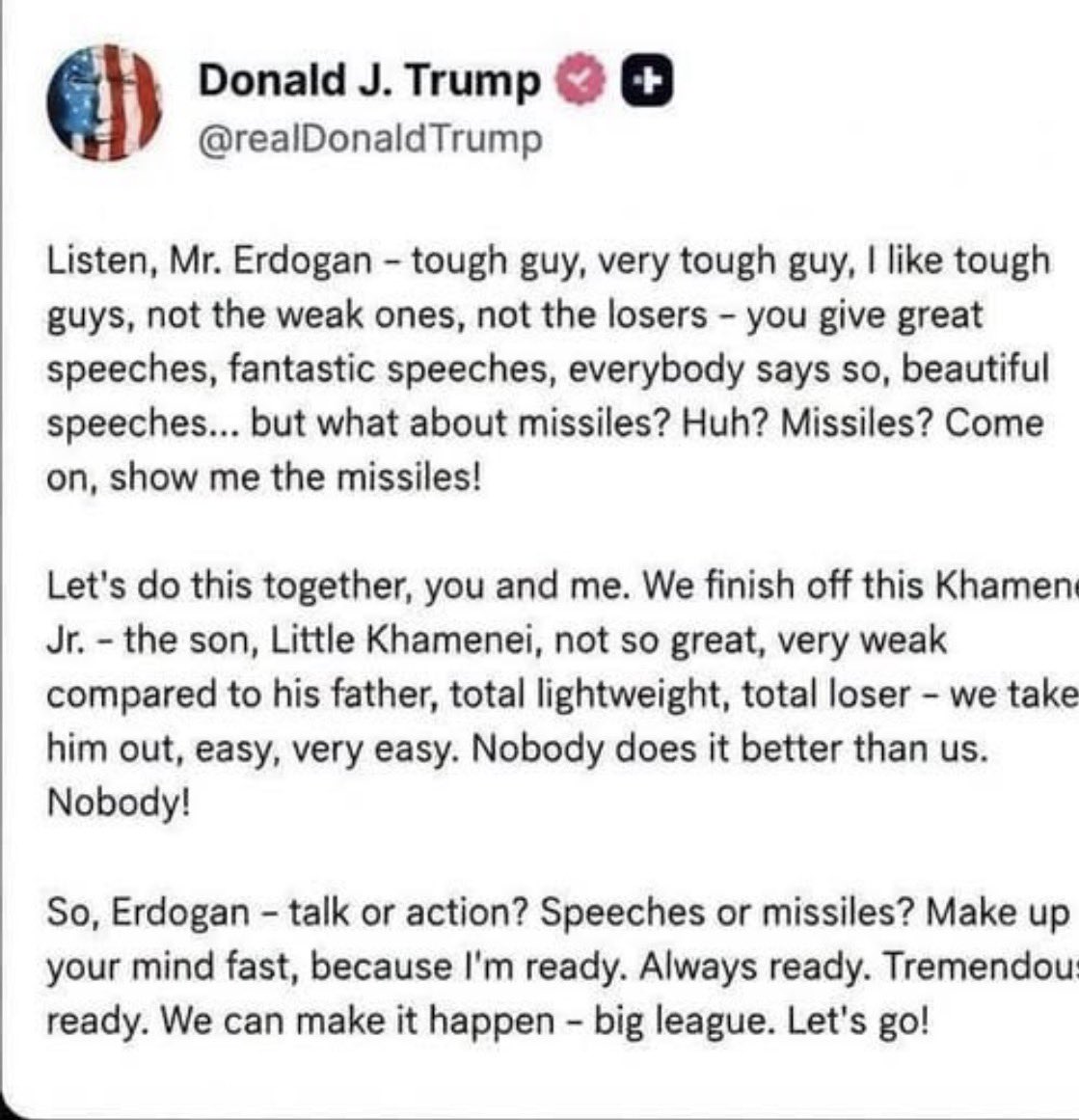 >>530367063Trump isn't writing his own social media posts for a long time.It's been quite obvious recently. It might evn be some indian intern using LLM trying to mimic how Trump speaks.