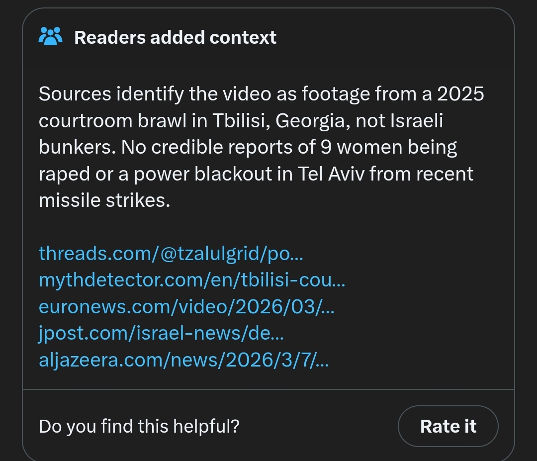 >>530380249>Sources identify the video as footage from a 2025 courtroom brawl in Tbilisi, Georgia, not Israeli bunkers. No credible reports of 9 women being raped or a power blackout in Tel Aviv from recent missile strikes.They should really move all the schizo anti semites to their own board so pol can be useable again, you guys are too stupid.