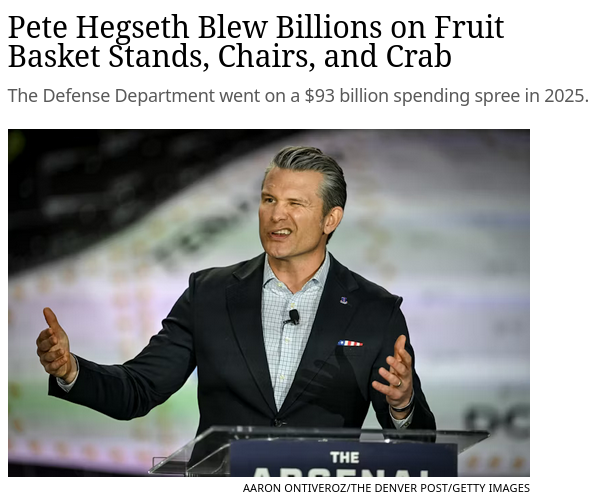 gee you think maybe DOGE is gonna look at this?https://newrepublic.com/post/207555/pete-hegseth-billions-dollars-fruit-basket-stands-chairs-crab