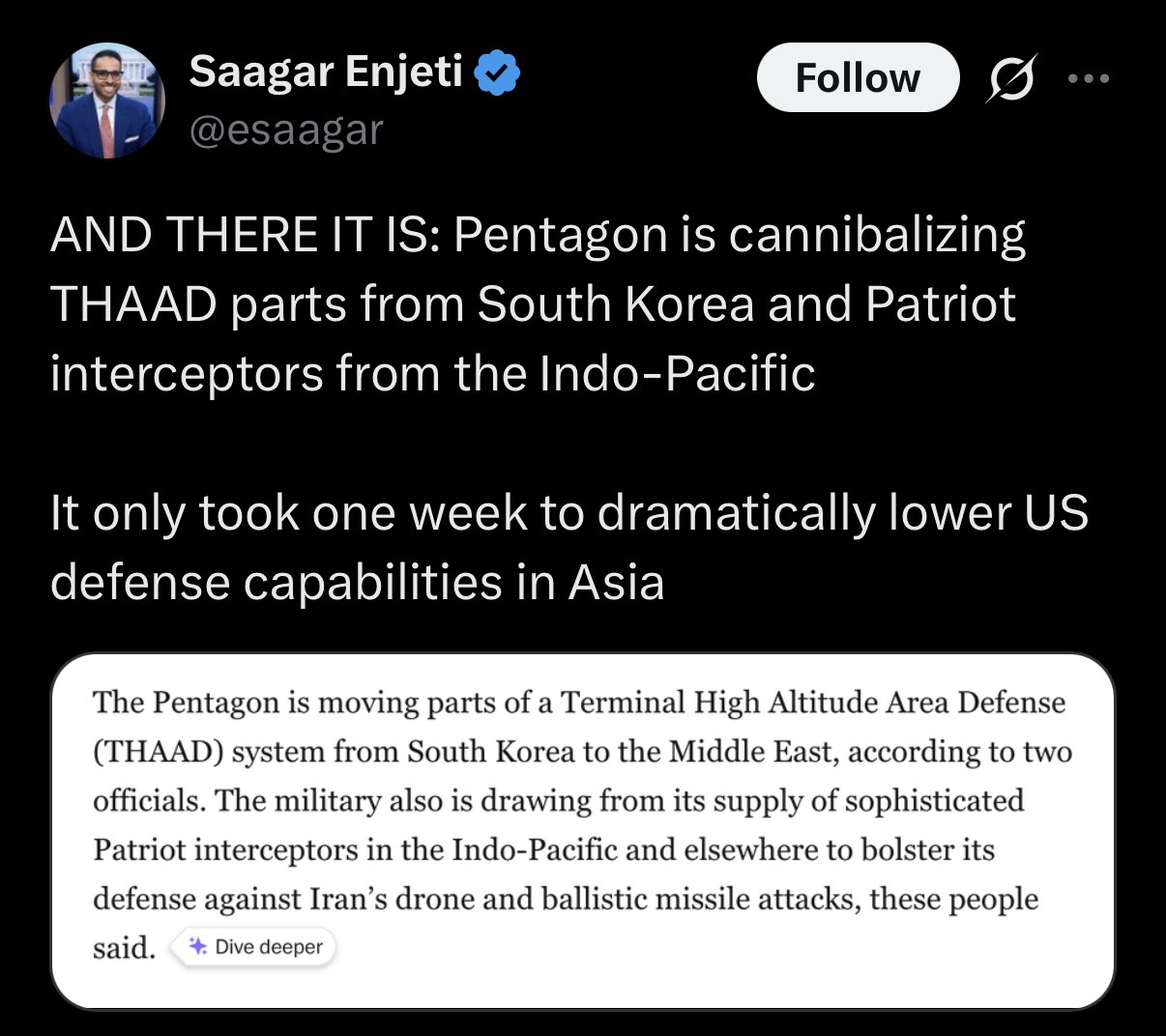 Losing 4 THAAD systems is a $8 billion hole that you can't just fix by printing more money. Iran already won by exposing that the US can't protect Israel and Asia at the same time lol The US is literally trading irreplaceable strategic assets for cheap suicide drones.Mathematically, the US has already lost. The production lines can’t keep up, the national debt is exploding, and the global defense web is now full of holes lol