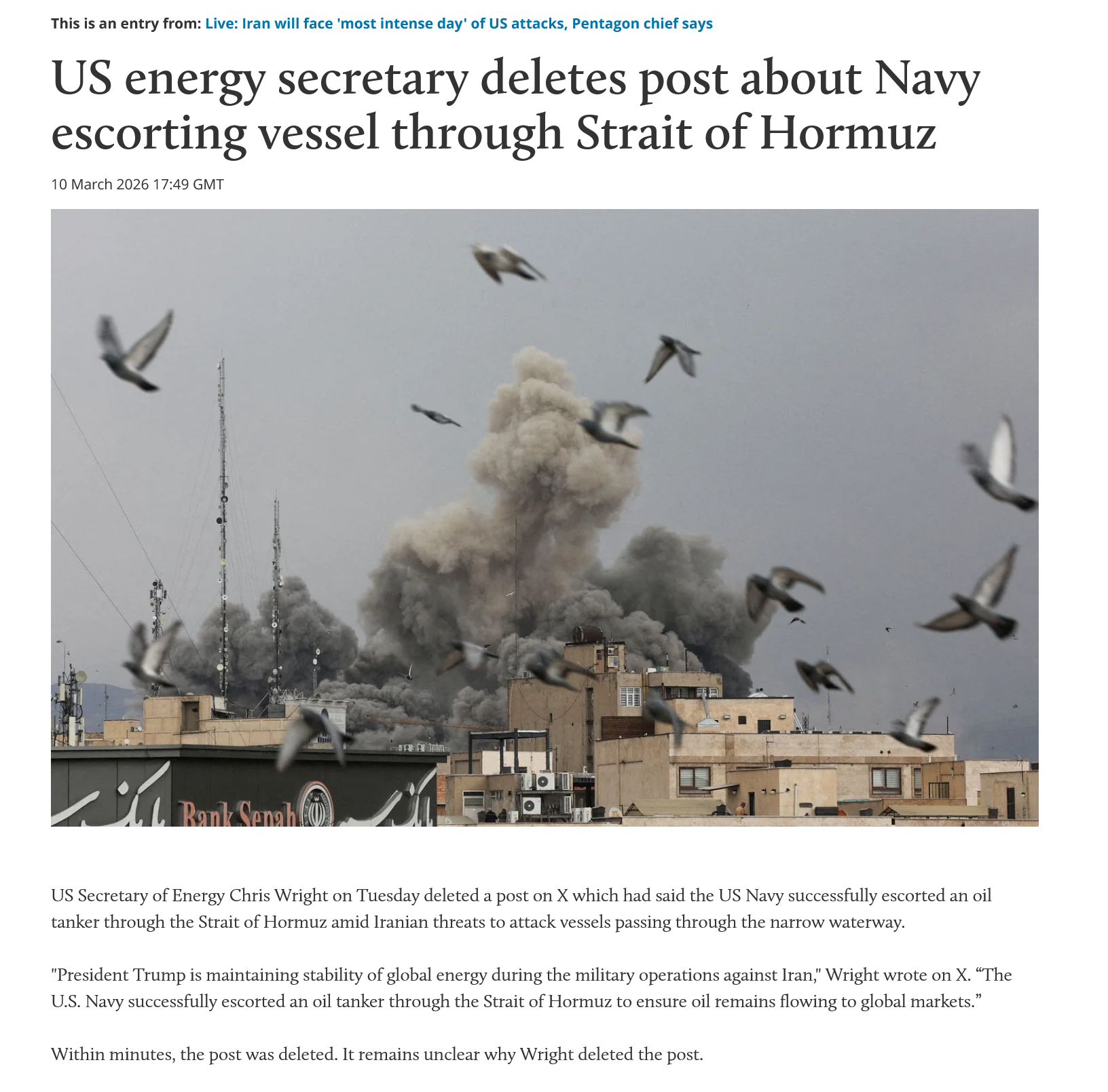 >U.S. Navy has successfully escorted an oil tanker through the Strait of Hormuz - U.S. Energy Secretary says
