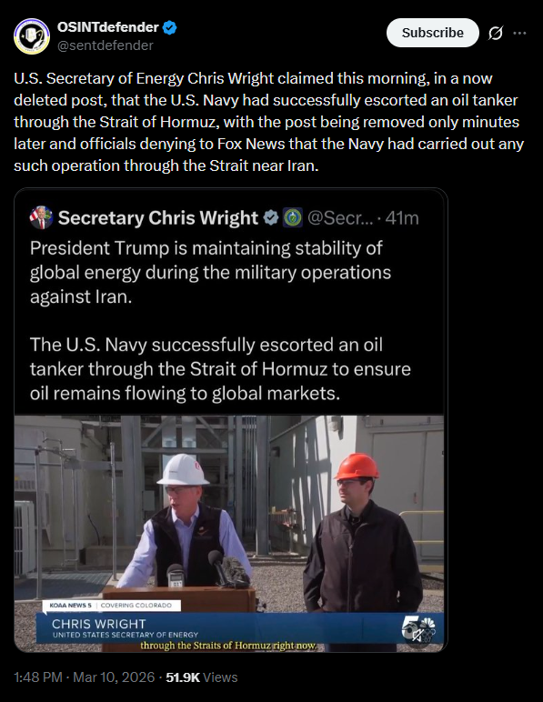 https://x.com/i/status/2031433601925968125U.S. INTELLIGENCE ASSETS HAVE BEGUN TO SEE INDICATIONS IRAN IS TAKING STEPS TO DEPLOY MINES IN STRAIT OF HORMUZ