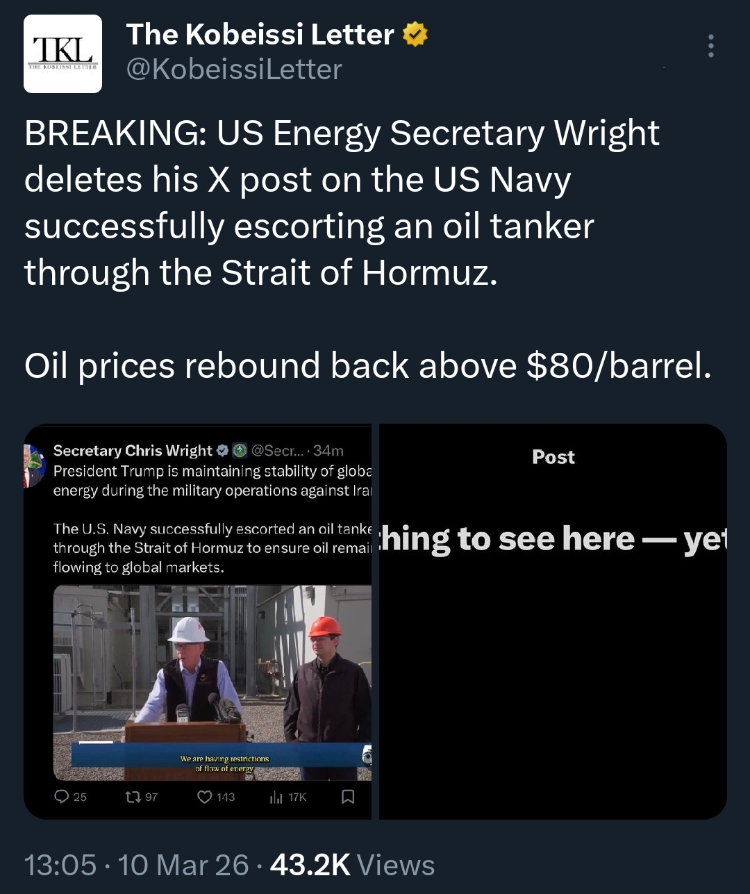 >>530393527 >NO U.S. ESCORTS IN HORMUZ STRAIT>According to military sources cited by Jennifer Griffin, no U.S. military assets have escorted oil tankers through the Strait of Hormuz, contradicting claims made by Energy Secretary Chris Wright. NO U.S. ESCORTS IN HORMUZ STRAIT According to military sources cited by Jennifer Griffin, no U.S. military assets have escorted oil tankers through the Strait of Hormuz, contradicting claims made by Energy Secretary Chris Wright. >NO U.S. ESCORTS IN HORMUZ STRAIT>According to military sources cited by Jennifer Griffin, no U.S. military assets have escorted oil tankers through the Strait of Hormuz, contradicting claims made by Energy Secretary Chris Wright. NO U.S. ESCORTS IN HORMUZ STRAIT According to military sources cited by Jennifer Griffin, no U.S. military assets have escorted oil tankers through the Strait of Hormuz, contradicting claims made by Energy Secretary Chris Wright. >NO U.S. ESCORTS IN HORMUZ STRAIT>According to military sources cited by Jennifer Griffin, no U.S. military assets have escorted oil tankers through the Strait of Hormuz, contradicting claims made by Energy Secretary Chris Wright. NO U.S. ESCORTS IN HORMUZ STRAIT According to military sources cited by Jennifer Griffin, no U.S. military assets have escorted oil tankers through the Strait of Hormuz, contradicting claims made by Energy Secretary Chris Wright. >NO U.S. ESCORTS IN HORMUZ STRAIT>According to military sources cited by Jennifer Griffin, no U.S. military assets have escorted oil tankers through the Strait of Hormuz, contradicting claims made by Energy Secretary Chris Wright. NO U.S. ESCORTS IN HORMUZ STRAIT According to military sources cited by Jennifer Griffin, no U.S. military assets have escorted oil tankers through the Strait of Hormuz, contradicting claims made by Energy Secretary Chris Wright.
