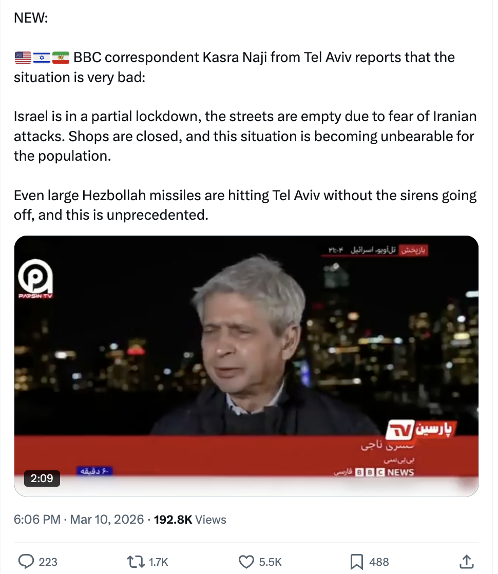 BBC correspondent Kasra Naji from Tel Aviv reports that the situation is very bad:Israel is in a partial lockdown, the streets are empty due to fear of Iranian attacks. Shops are closed, and this situation is becoming unbearable for the population.Even large Hezbollah missiles are hitting Tel Aviv without the sirens going off, and this is unprecedented.