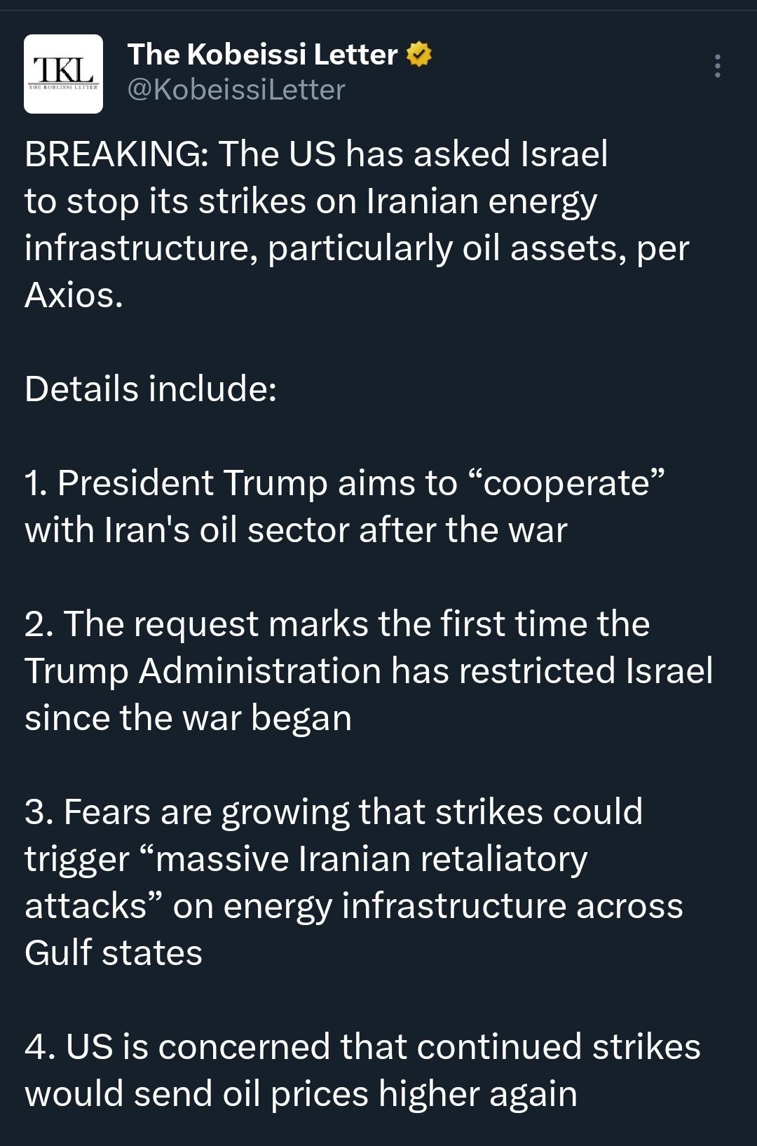 >>530393527The U.S. has asked Israel to stop striking Iran’s energy and oil infrastructure, warning it could harm civilians, spike global oil prices, and trigger wider retaliation against Gulf energy facilities.Trump administration also wants to preserve Iran’s oil sector for potential post-war cooperation.Source: Axiosshabbos goy award goes to every single pro israel retard