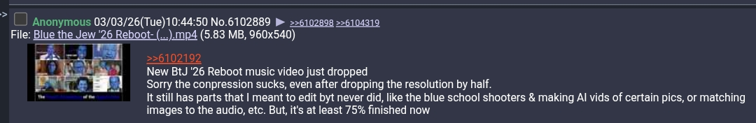 OPERATION BLUE THE JEW IS BACK>Useful Links To Catch Up>/OBTJ/ '26 REBOOTAdd the thread number to the 1) 2/6/26 https://archive.4plebs.org/pol/thread/5279368602) 2/7/26 https://archive.4plebs.org/pol/thread/5279970943) 2/9/26 https://archive.4plebs.org/pol/thread/5281462474) 2/10/26 https://archive.4plebs.org/pol/thread/5281462475) 2/12/26 https://archive.4plebs.org/pol/thread/5283326736) 2/16/26 https://archive.4plebs.org/pol/thread/5285990647) 2/17/26 https://archive.4plebs.org/pol/thread/5286768048) 2/18/26 https://archive.4plebs.org/pol/thread/5287510998b) 2/19/26 https://archive.4plebs.org/pol/thread/52880898410) 2/21/26 https://archive.4plebs.org/pol/thread/52894307611) 2/22/26 https://archive.4plebs.org/pol/thread/529012749>/OBTJ/ 2019Threads 1 to 44: 2 Variants (Might have diffs)> A) https://pastebin.com/qQc0jC1v> B) https://pastebin.com/ufb62iLK11/18/19 https://archive.4plebs.org/pol/thread/233582032 BtJ Catch Up>/OBTJ/ 2024https://pastebin.com/PB2pwDsV>OBTJ VIDEOSOFFICIAL OPERATION BLUE THE JEW '26 REBOOT MUSIC VIDEO>>>/wsg/6099212 BTJ Music Video '19>>>/wsg/6097721BTJ Music Video: Anne Frank Edition>>>/wsg/6097725BTJ Video by Patrick Bishophttps://x.com/psyop4921/status/2025452793432064413>>>/wsg/6097717Tony Rigatoni's BTJ Video (@TonyRigatonee) https://x.com/i/status/1919950029822795913>>>/wsg/6097724Video by WhiteFacE - It's The Jews (@itsthejews58)https://x.com/i/status/1772326871302087167>>>/wsg/60977302 BTJ SORA Vids As Examples: Grok Is Also Great At Making Vids From BTJ Pics>>>/wsg/6097733>>>/wsg/6097740Jew explains the infamous NYT Charts of the Most Powerful/Influential People in USA>To demonize Whites for being super overrepresented>Instead showed jews are INSANELY overrepresented in positions of power/influence>>>/wsg/6093633