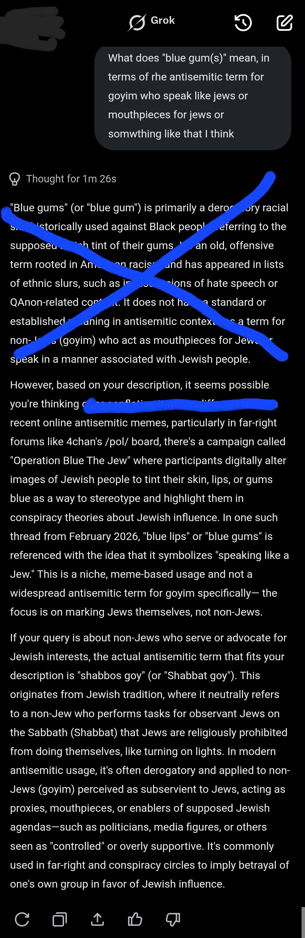 >>530420689That's what blue lips are for (Blue Gums = speak for like the jews, or mouthpieces for the jews)Even Grok knoes this when prodded>Picrel Part 1