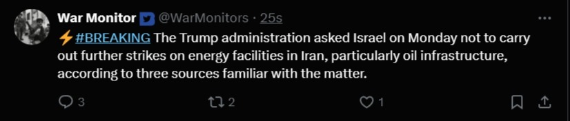 US begging Israel to leave Iran infrastructure alone