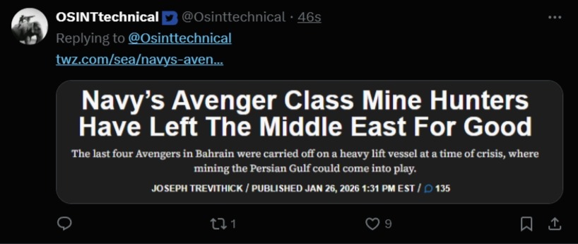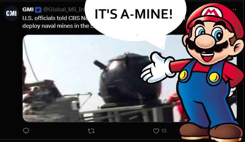 Fucking kekThere are no mine sweepers left in the middle easthttps://www.twz.com/sea/navys-avenger-class-mine-hunters-have-left-the-middle-east-for-goodThey got decommed in January