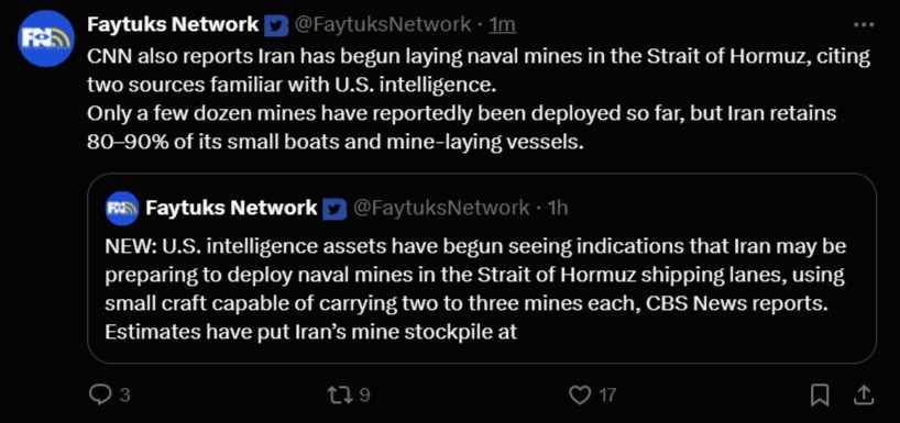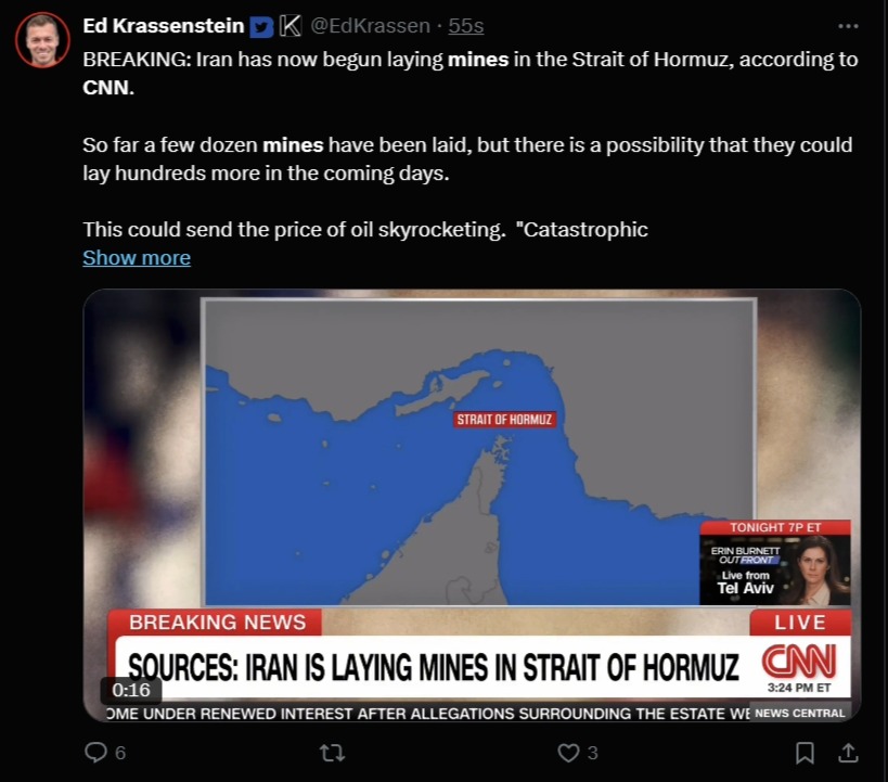 >>530399951>I am going out on a limb he is lying when he says they dont have proofI'm going to say this is kike-seeded pilpul they made up an hour ago, which is why Trump responded with "I haven't heard anything about this".Iran has absolutely 0 reason to mine the strait right now.