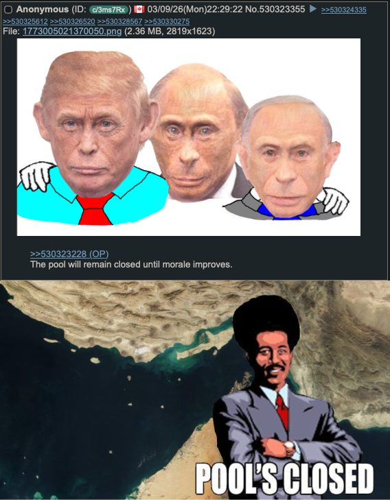 >>530400169why notit shuts the strait for weeks, that automatically puts oil up to $150 the pressure will be massivewe dont know the situation in Iran really, its desperate but maybe they are desperate