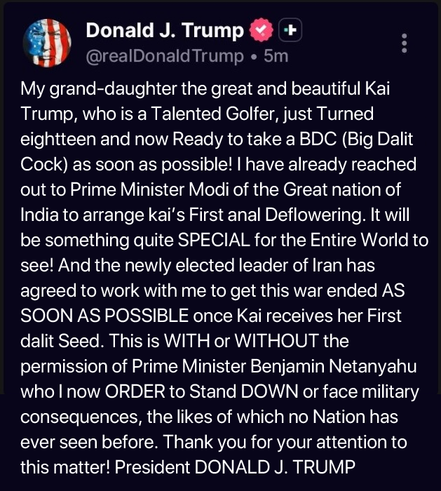 >>530402451>shitposting on maga twitter against the enemy in an ongoing war>in real time>on multiple occurences>by the actual president of the USAFingers crossed that he starts calling the new Iran leader a faggot wearin' sandnigger, just for shits and giggles.