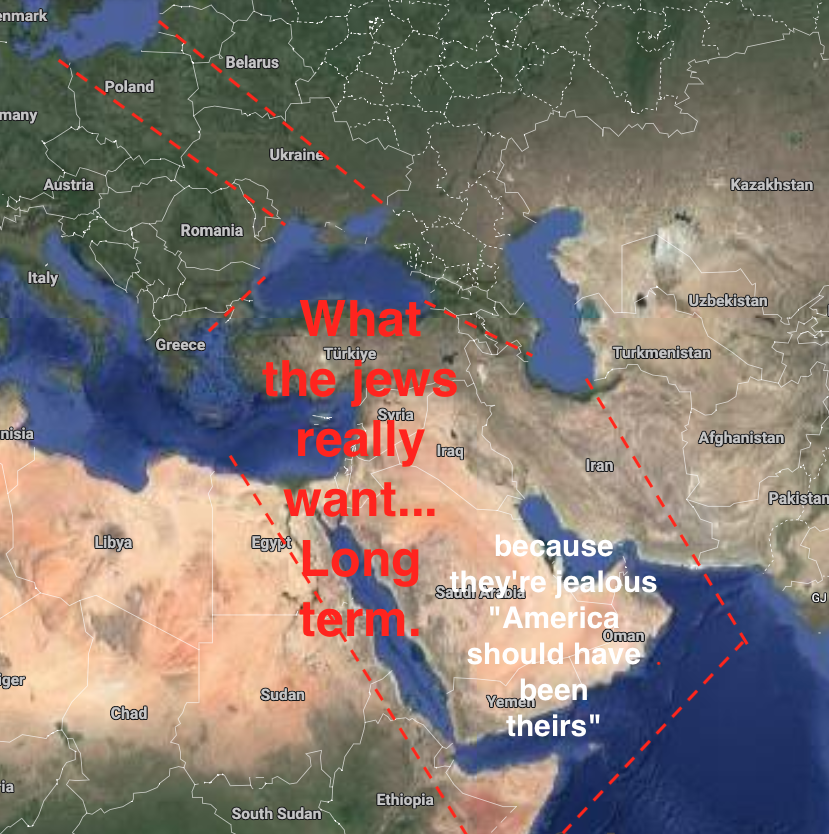 >>530404525Realistically the great Israel project is an absolute pipe dream. Iran simply gets in the way but you also have to take on Egypt, Turkey and saudi arabia... and then you jave to hold all of this incredibly hostile territory? Jews are delusional, this just confirms it beyond a shadow of a doubt.