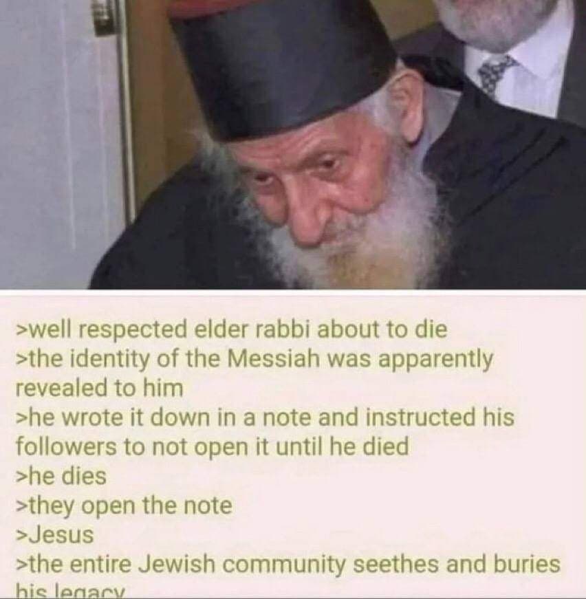>>530413591It's not optimism as much as it was a call to spread and normalize the talking point. If you explained it in a calm and rational manner then most of the midwit funders of ziobullshit would not know how to reply. Even the actual attempt for them to explain their way out of "Your religion has ceased to function or be valid since the destruction of the temple as Christ predicted" involves a long winded diversion game that uproots other things along the way.>>530413766>evangelicals are their own breed of crazywill agree there>must say pope is the antichrist because its part of my protest loreThis is another bizarre obsession of protestants. Even in what he said he could be referring to a non-Catholic or secular figure who subdues the church, bans it, or whatnot.