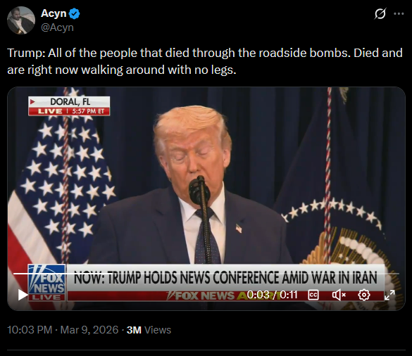 >Trump: All of the people that died through the roadside bombs. Died and are right now walking around with no legs.https://x.com/Acyn/status/2031128858309833083