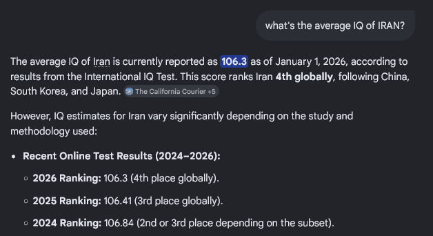 >>530407275"international IQ test" means online test, which is not validI wouldn't be surprised if Iranians were smarter than Americans on average, but I wouldn't put any bets on it.