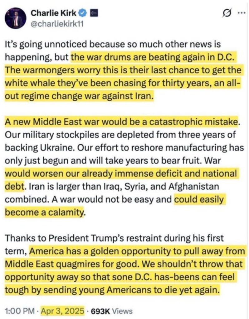>>530407875100% murdered at the request of Israel.Anyone who says different has zero credibility, especially in light of the Iran attack, which Kirk was openly vocally against.Trump had Kirk murdered for Israel.