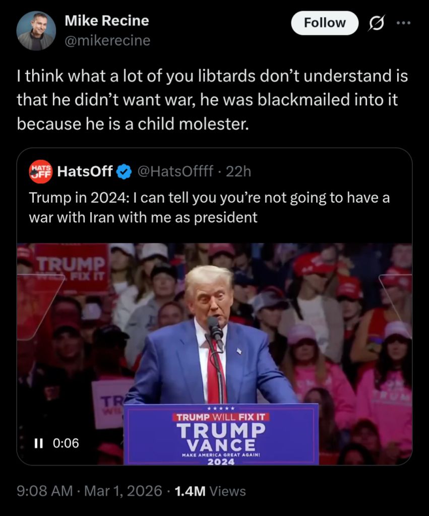 >Remember what you’re fighting for in those trenches in IranCOMPLETE JEWISH SUPREMACY. BASED! MAGA