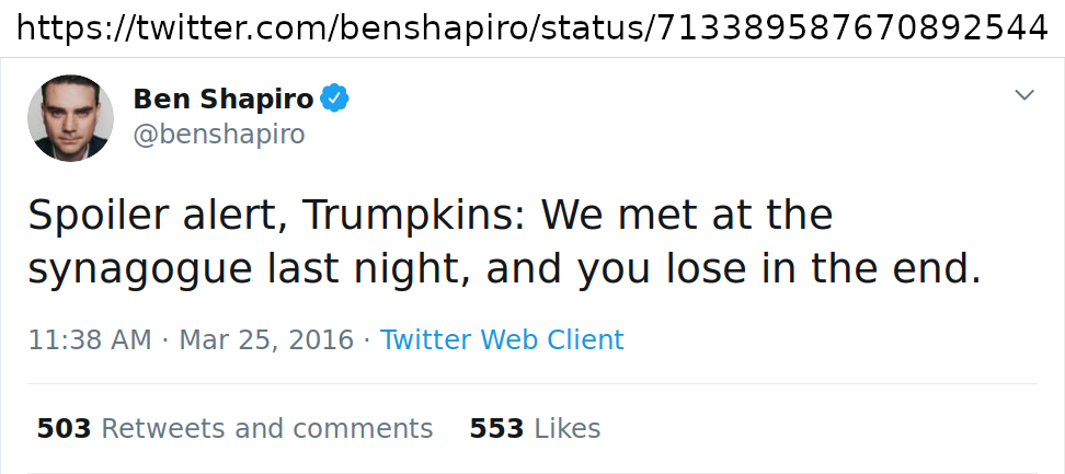 >>530415366>never-Trumper serial liar ben shapiro he’s on your team retard, go cry about muh 50 beheaded schoolgirls some more