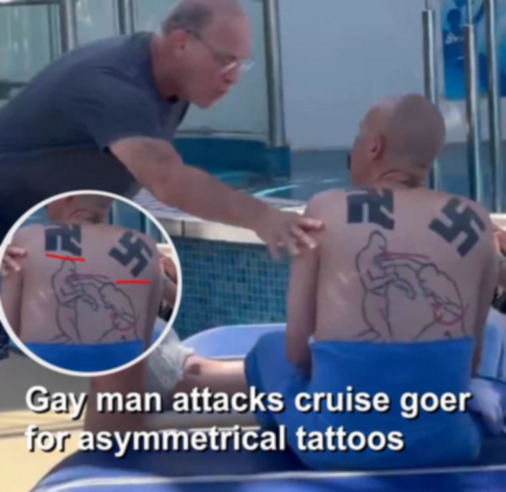 What kind of evil bastard not only gets hate symbols tattooed on his body but goes out of his way to flaunt them in front of the public? This man is brave for making a stand.