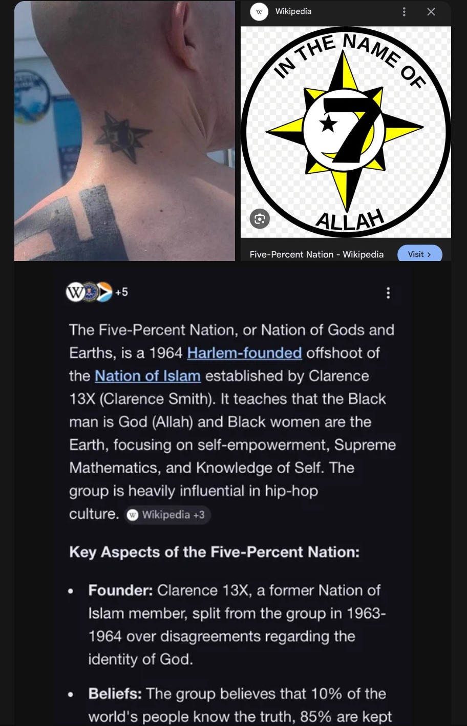 >>530415676>The Five-Percent Nation, sometimes referred to as the Five Percenters or the Nation of Gods and Earths (NGE/NOGE), is a movement influenced by the Nation of Islam founded in 1964 in the Harlem section of the borough of Manhattan, New York City, by Clarence 13X, a former member of the Nation of Islam who was previously known as Clarence Edward Smith.>Members of the group call themselves Allah's Five Percenters, which reflects the concept that ten percent of the people in the world are elites and their agents, who know the truth of existence and opt to keep eighty-five percent of the world in ignorance and under their controlling thumb; the remaining five percent are those who know the truth and are determined to enlighten the eighty-five percent.>The Nation of Gods and Earths teaches the belief that Black people are the original people of the planet Earth and are therefore the fathers ("Gods") and mothers ("Earths") of civilization. The Nation teaches that Supreme Mathematics and Supreme Alphabet, a set of principles created by Allah the Father, is the key to understanding humankind's relationship to the universe. The Nation teaches that the black man, insofar as the Nation defines this race, is himself God, with the black race being a race of actual gods.