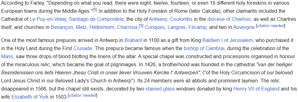 Did you know that for around 400 years during the middle ages and early modern period it was a trend to claim that your church contained a piece of mummified jew penis? Christians would fight over the opportunity to proudly display the "holy prepuce", jesus' supposed 1500 year old foreskin obtained from his initial jewish birth ceremony in which he was ritually circumcised.https://en.wikipedia.org/wiki/Holy_Prepucehttps://www.cbc.ca/radio/ideas/how-jesus-foreskin-became-one-of-christianity-s-most-coveted-relics-and-then-disappeared-1.6002421https://www.medievalists.net/2024/04/holy-foreskin-medieval-relic/