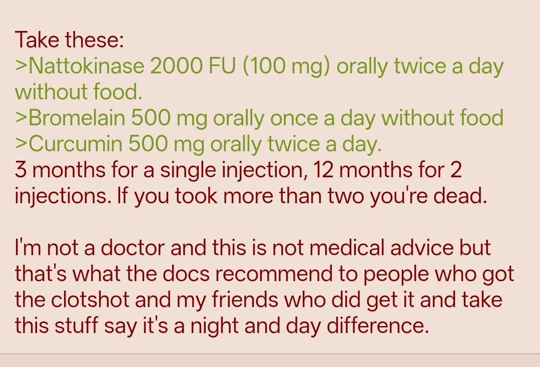 >>530416916>Protease enzymes have been shown to degrade and reduce Covid/Vax spike proteins in the body. They also reduce the fibrin proteins that cause blood clots and myocarditis.As well as any other protein they can get their greedy little residues on.Also>in the body>https://pmc.ncbi.nlm.nih.gov/articles/PMC9458005/What part of "When cell lysates transfected with S protein were incubated with nattokinase, the S protein was degraded in a dose- and time-dependent manner" fails to compute?This lack of comprehension is gone michaelis your menten one day.>Serratiopeptidase is a large part of what makes your bladder lining dissolve when you're dying of catheter-associated bacteremia.Anyway, these niggers manage to go at it straight-faced and at least throw out the most grossly harmful shit:https://pmc.ncbi.nlm.nih.gov/articles/PMC10222799/4.4. and 4.5. are what OP seems to be looking for, by and large GRAS OTC stuff, and most of Table 2 is also pretty harmless (Nutmeg may be the most dangerous) and a lot are good for you anyway.Anon can't see anything grossly harmful in the mentioned sections/table at a quick glance and they're probably even safe enough to be printed out for mom to read and share.Fuck supplement shit. Natto or pineapple. Aand if she likes natto, better make it at home with good beans, not that molded up commercial shit. It's a good probiotic if you can stand it.It's not as if a peroral macropeptide would get functionally intact into the bloodstream much better anyway if you take it as supplement. When they chop em up for sequence analyses in molbio it's literally called "digestion". So just save money and go for the real-food variant. It's safer too, bromelain intake from pineapple is self-limiting because it will ultimately make your mouth bleed which is more easily noted than it eating your stomach lining.Hope that helps.