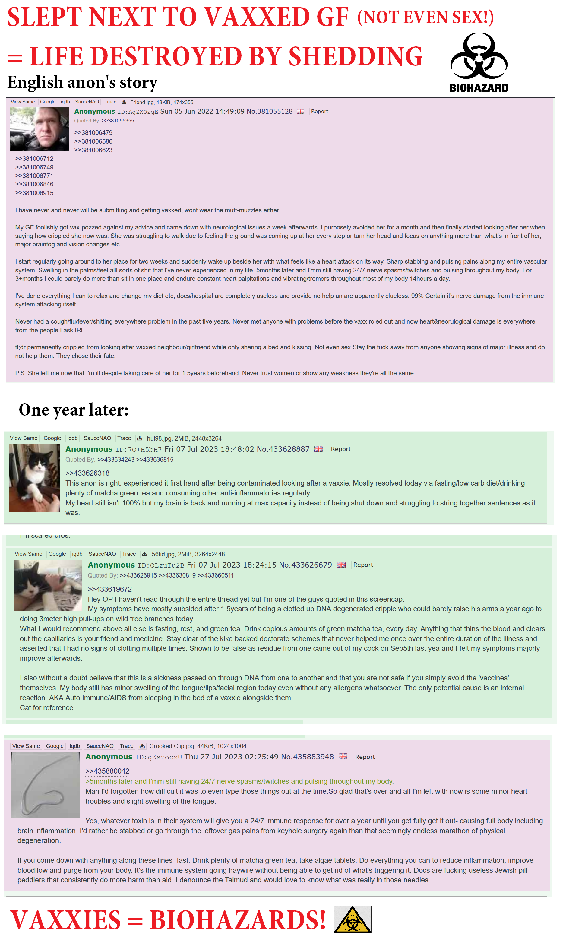 >>530415998>>530416405>>530416496There is nothing to be done. There are no treatments. Nobody knows how long the mRNA lingers in immune cells that consume infected cells, and nobody knows if the immune cells start producing them too. Fuck, it can even vary from person to person just like the adverse reactions. Not everyone gets myocarditis, some get encephalitis. Not everyone gets bloodclots, some get Guillain-Barre syndrome. There is no "cleanse" and anybody saying there might be is a fraud.