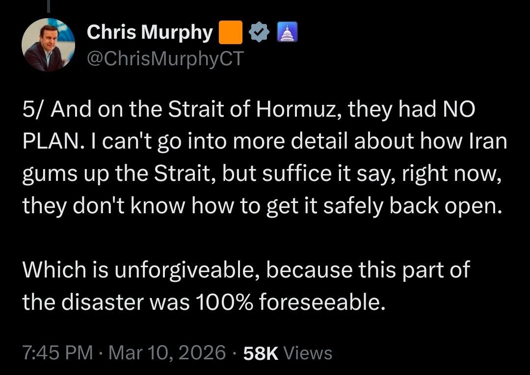 Senator Murphy gives insight on what's happening behind the scenes.There's multiple parts, but the TL;DR is they have no way to convince Americans why the war exists and no solution to Iran blocking the Strait of Hormuz