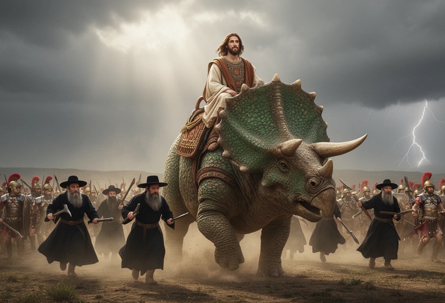 Dinosaurs have long played a pivotal role in the shared Judeo-Christian heritage. Picrel is a classical oil painting of Jesus leading the rabbis and Roman legions into battle during the Judeo-Roman Invasion of Persia, circa 31 AD.