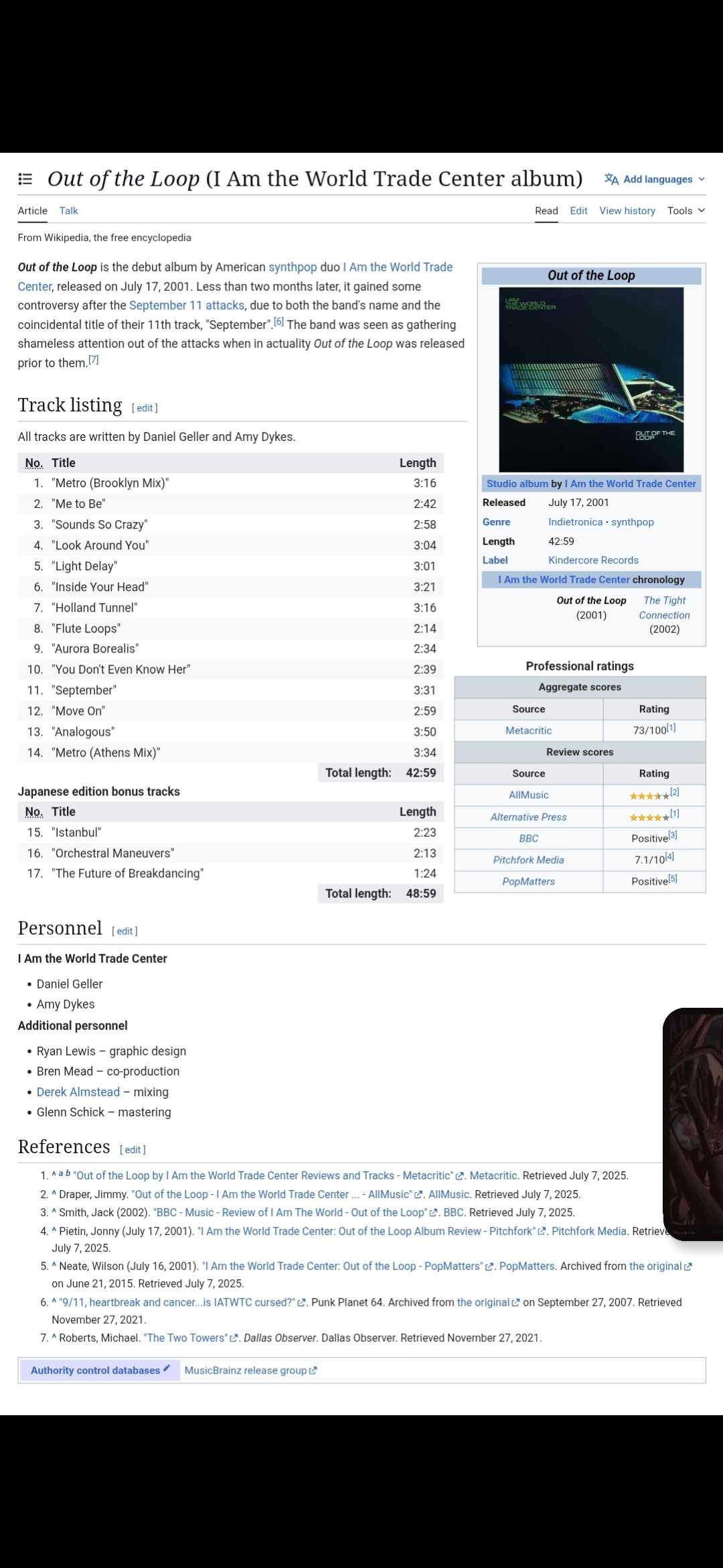 Ok. So apparently there is/was this band called I Am The World Trade Center that released an album in July of 2001 with the 11th song being called September. Here is the Wikipedia article on it:https://en.wikipedia.org/wiki/Out_of_the_Loop_(I_Am_the_World_Trade_Center_album)The whole thing is a Mandela Effect. There is no way something so blatant in its predictive programming would not have brought up as much if not more than the Simpsons example. And before one of you cluckers say "But this is an obscure band, of course it would stay hidden for awhile.", concider the fact that other similarly obscurish pieces of 9/11 predictive programming has been noted as 9/11 PP for over a decade now like Blue Gender and the animated series of Sabrina.Not only that, the title of the songs in the album and the album and even the name of at least one of the members are like messages.>Out of the Loop is a reference to the ME making you feel not in the know of something this big>Sounds Crazy is a reference to the fact this sounds skitzo af>Inside Your Head is saying whatever tf is doing this is really effing with our minds, probably the matrix runner, and it is the 6th song, a demon reference too>Move On is an order to let this insane find go after a certain amount of time. Like basically "Yes, this is a skitzo af happening, now get tf over it.">Amy Dykes is a demon reference as Amy is the name of 1 of the 72 demons of the Goetica.What do you nake of this anons? Do you remember hearing about this or did this get retconned into our matrix by a demon for whatever reason?Thanks in advance as always!