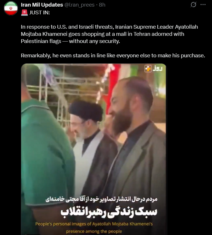 >>530437934Hey, Tousi apparently has """sources""" that claim Mojtaba is currently in a coma, missing a leg, and (though this part is pure speculation from Tousi) might very well have been killed on that first day and the reason why they hauled out that cardboard cutout of him is simply because the nigga's dead lmao.