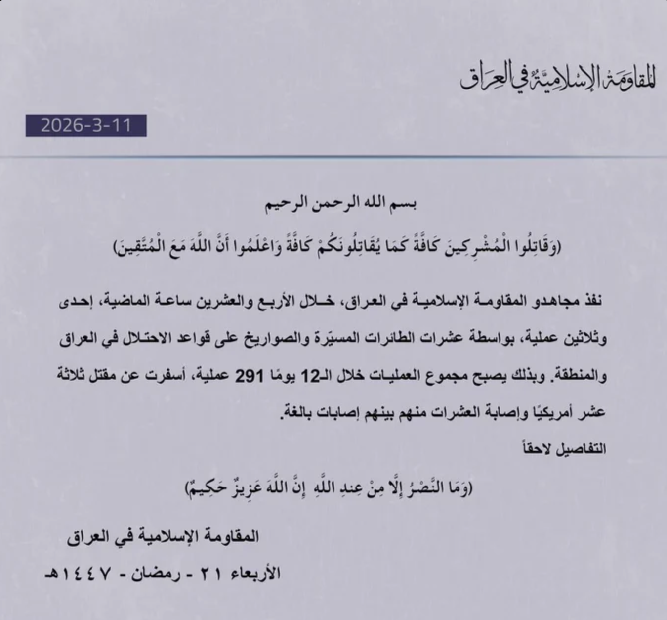 Iraqi proxies claim to have killed 13 US soldiers since the war began.>The fighters of the Islamic Resistance in Iraq carried out 31 operations in the past 24 hours, targeting the occupying forces in Iraq with drones and missiles. This brings up the total number of operations to 291 across 12 days, which resulted in the extermination of 13 Americans and dozens of injuries, many of which are serious.