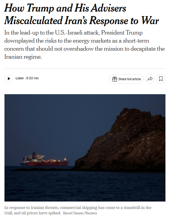 Before launching military strikes on Iran, Trump and several advisers believed the conflict would not seriously disrupt global oil markets. They expected any rise in oil prices to be brief and assumed Iran would respond similarly to the limited reaction during the previous year’s short war. As a result, warnings that Iran might try to disrupt shipping through the Strait of Hormuz, a key route for about 20% of the world’s oil supply, were largely dismissed.https://www.nytimes.com/2026/03/10/us/politics/how-trump-miscalculated-iran-response.html