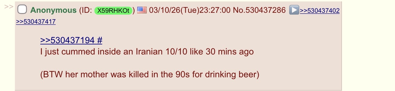 >>530438137>Its not an Option anon, Iran age of consent is literally 9 years old. Iranians are pedophiles, by law and definition. Don't try to minimize reality with your slimy words. Iranians are a pedophile countryits still the business of Iranians alone, not yours. Just like the travesty of homelessness in the USA is the business of no one but Americans. And i can guarantee you, there are a lot more homeless deaths or school shooting deaths in the USA than 9 year old brides in Iran.