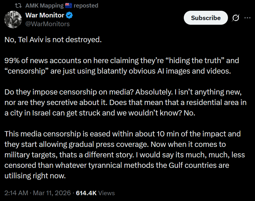 >No, Tel Aviv is not destroyed. >99% of news accounts on here claiming they’re “hiding the truth” and “censorship” are just using blatantly obvious AI images and videos. >Do they impose censorship on media? Absolutely. I isn’t anything new, nor are they secretive about it. Does that mean that a residential area in a city in Israel can get struck and we wouldn’t know? No. >This media censorship is eased within about 10 min of the impact and they start allowing gradual press coverage. Now when it comes to military targets, thats a different story. I would say its much, much, less censored than whatever tyrannical methods the Gulf countries are utilising right now.tel aviv holds!