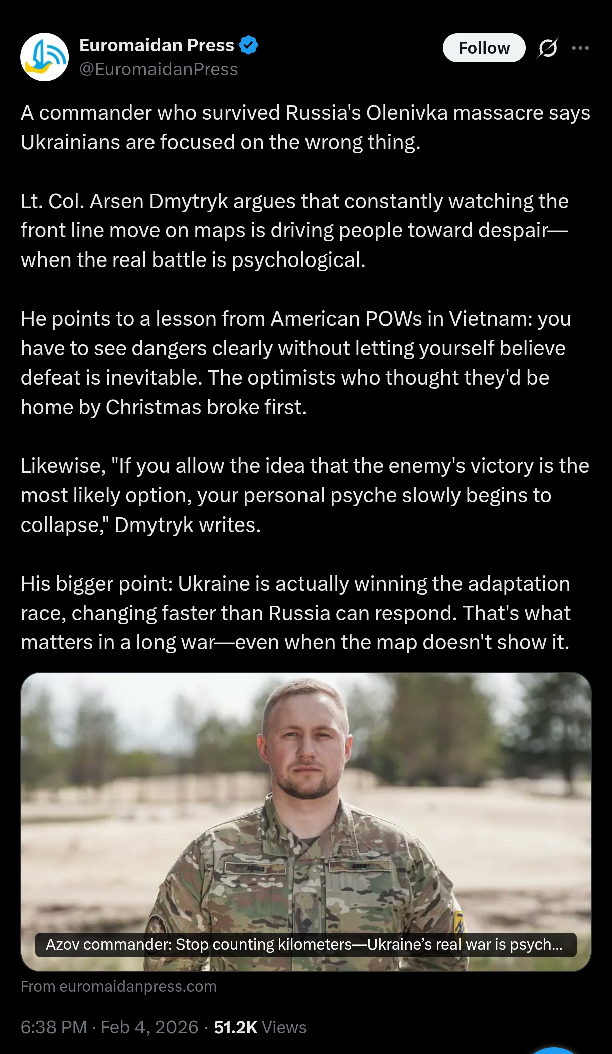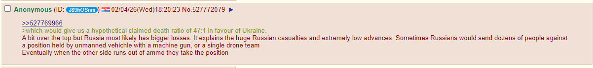 >>530439295I really don't think Konstantinovka will hold for more than 2 weeks. Unironically, it's falling pretty rapidly. And yes, by the summer, the entire Donetsk basin will be wrapped up and Russia will probably try and settle this. >>530439473Hohols are doing a YOLO peremogarun: >>530438354I won't give credit when credit is due, they did found a gap in the Russian lines and did exploit it. They made headway. But on a global scale, this entire operation for them is pointless and it has no strategic goal whatsoever. The Russians are literally letting them run amok a bit while pushing deeper inside Dnipropetrovsk and the hohols can't do anything about it. At all.
