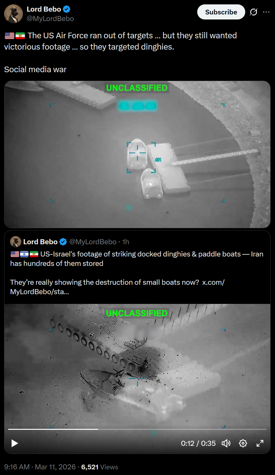 >The US Air Force ran out of targets … but they still wanted victorious footage … so they targeted dinghies.>US-Israel's footage of striking docked dinghies & paddle boats — Iran has hundreds of them stored LOLOLOL