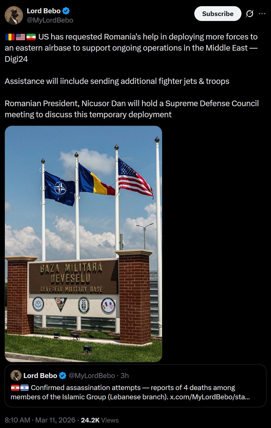 >US has requested Romania's help in deploying more forces to an eastern airbase to support ongoing operations in the Middle East — Digi24>Assistance will iinclude sending additional fighter jets & troops>Romanian President, Nicusor Dan will hold a Supreme Defense Council meeting to discuss this temporary deployment