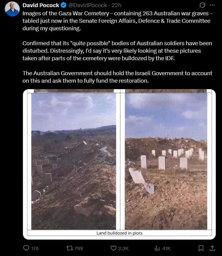 >Australian war graves in gaza desecrated by the IDFPalestinians tended these graves for decades, jews did't give it a second thought before bulldozing it all so they can build some seaside condos.