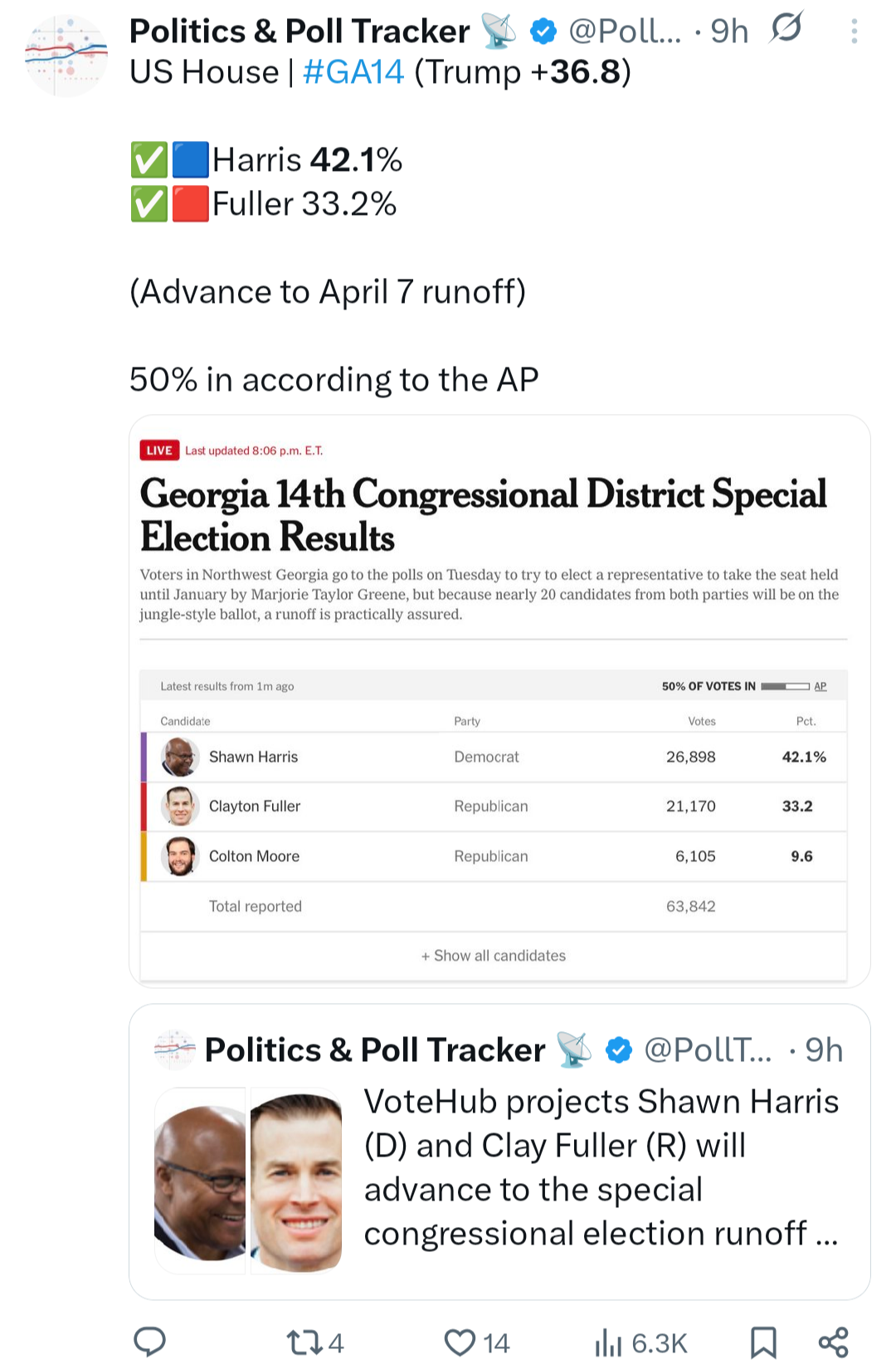 Major red flags for the GOP. If GA-14 could be within 10 points in the runoff, that's crazy. This at one point was a 40 point Republican district.