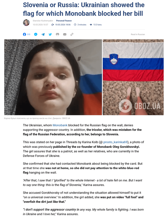 >>530487404>Be Ukrainian>Download online banking app>Take verification photo>Bank freezes your account because there's a Russian flag in the background>It's actually a Slovenian flag>Bank employee posts your photo online for millions to see, calling you a Russian collaborator>Even though you support Ukraine and your father is a member of the AFUhttps://sfg.media/en/a/monobank-accuses-client-collaboration-slovenian-flag-mistake/I would love to see /uhg/ try to justify this one.