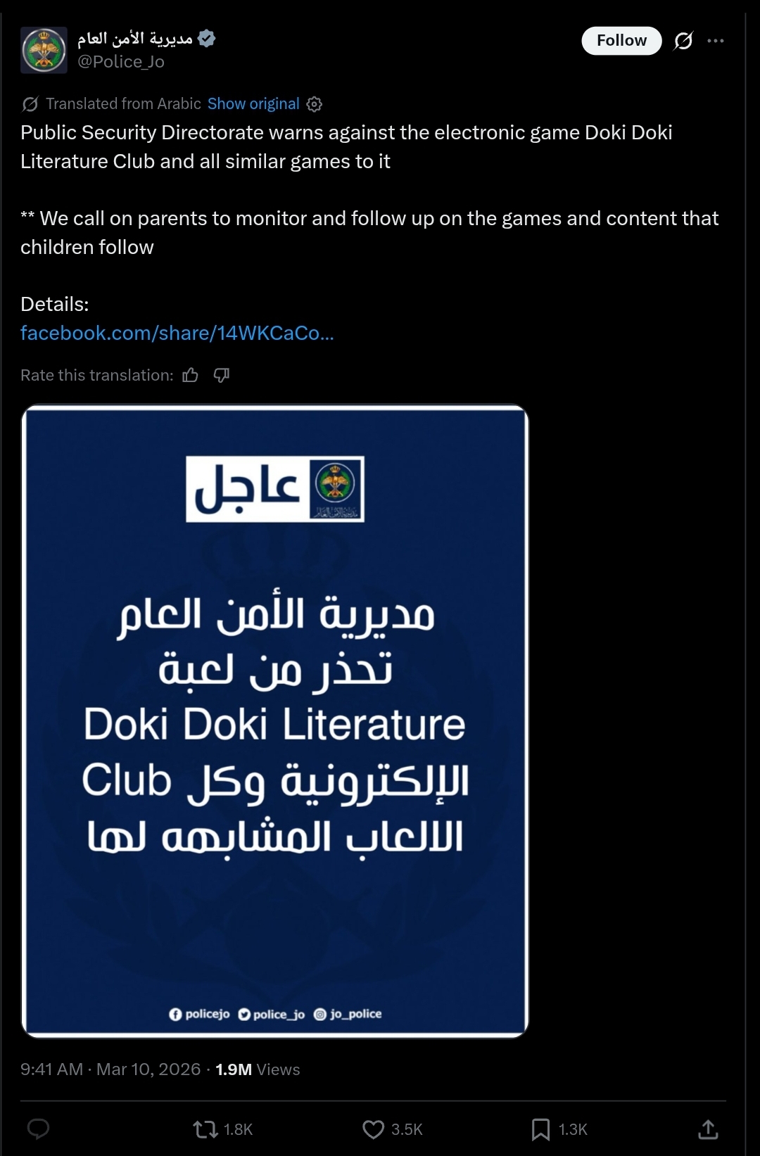 BREAKING: Jordanian apolice warns parents of the danger of Doki Doki Literature Club and all similar gameshttps://x.com/Police_Jo/status/2031410145427616135